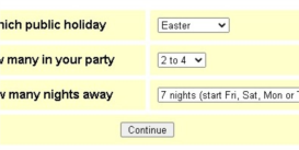 There are three "early" season public holidays to take advantage of. Easter in particular, is now selling well for Good Friday to Easter Monday breaks. Select a public holiday, how many people in your party and for how many nights you want to be away to list what's still available by date.